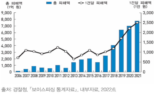보이스피싱은 통신 매체를 이용하여 불특정 다수를 기만하고 금전적 이득을 취하는 지능형 범죄로, 그 수법이 날로 교묘해지면서 심각한 사회 문제로 자리 잡았다. 과거 특정 연령층에 집중되었던 피해는 이제 연령과 계층을 가리지 않고 전방위적으로 확산되고 있으며, 1인당 피해액 또한 급증하는 추세로 범죄의 심각성이 더욱 커지고 있다[1]. <Figure 1>에 나타난 바와 같이, 보이스피싱 범죄는 2006년 최초 발생 이후 급격한 증가 추세를 보였으며, 최근까지도 여전히 심각한 수준을 유지하고 있다. 특히 <Figure 2>와 같이 1건당 피해 금액이 급증하는 추세는 보이스피싱 범죄가 더욱 지능화되고 고액 피해를 유발하는 형태로 진화하고 있음을 보여준다.