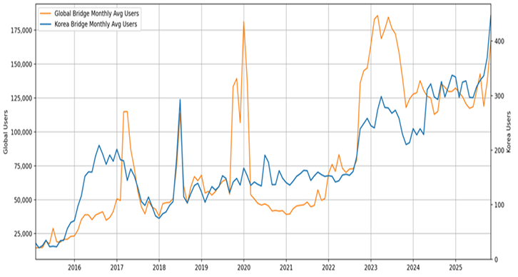 <Figure 2> 전세계 및 국내 브릿지 접속자 현황(2025년 10월 기준)