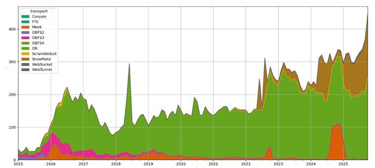 Bridge 이용자는 전 세계적으로 2015년 일일 평균 1만 9,642명에서 2025년 13만 809명으로 약 6.7배 증가했고, 한국도 같은 기간 37명에서 334명으로 약 9배 늘어 점유율도 0.19%에서 0.25%로 상승했다. 특히 2018년 obfs4 도입과 2022년 Snowflake 적용 시기에 Bridge 접속 증가가 두드러져 기술 변화가 국내 이용 패턴에도 영향을 미친 것으로 보인다.