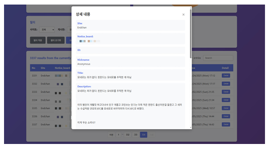 이 실험은 한국어로 운영되는 다크웹(이하 한글 다크웹)에서 유통되는 마약 실태와 구조를 분석하고, 수사기관의 정보기반 의사결정 체계를 지원하는데 목적이 있다. 다크웹은 구조적인 특성으로 인하여 표면 웹 조사 방식보다는 체계적 · 수동적으로 탐색하는 접근법이 요구된다[33]. 데이터는 2025. 3. 5. ~ 2025. 10. 5. 기간 동안 한국어로 운영되는 마약 다크웹 16개를 사용하였다. 이 중 현재 서버가 비활성화되어 있는 사이트 1개와 포럼 2개는 제외하여 총 13개 사이트를 설정하고 크롤링 기술을 통해 데이터를 수집하였다. 데이터는 텍스트만 총 3,337개 라인을 수집하였고, 용량은 10.9MB에 이른다. 마약 유통 체계는 수집 기간 동안 게시물 모니터링을 통해서 확인하였고, 연관성 분석을 위해 시각화 도구(I2 10.1 버전)로 수집한 데이터로부터 조직을 식별하거나 각 사용자들간 연계 분석이 가능한 요소로써 마약 홍보글로부터 지역 정보, 텔레그램 계정, 업로드 닉네임 등을 추출하였다.