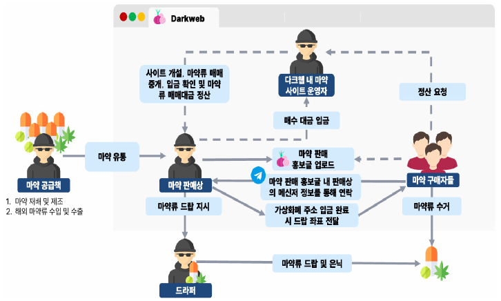국내 마약 유통은 상선이 해외 등지에서 마약을 반입하여 모집-유통-자금관리-홍보 등의 철저한 역할 분담과 피라미드 구조로 움직인다. 플랫폼 운영자(관리자·모더레이터)가 시장 질서를 관리하면서 지시한다. 상위 벤더(Vender)는 지시에 따라 마약 판매 및 홍보를 담당하고, 다수의 구매자를 상대한다. 이후 마약은 운반책 및 드랍퍼(Dropper)를 통해 지정된 장소에 전달되며, 구매자는 가상화폐로 거래 대금을 지급한다. 물류·에스크로·암호화폐 세탁이 외부 인프라를 통해 수행된다[3].