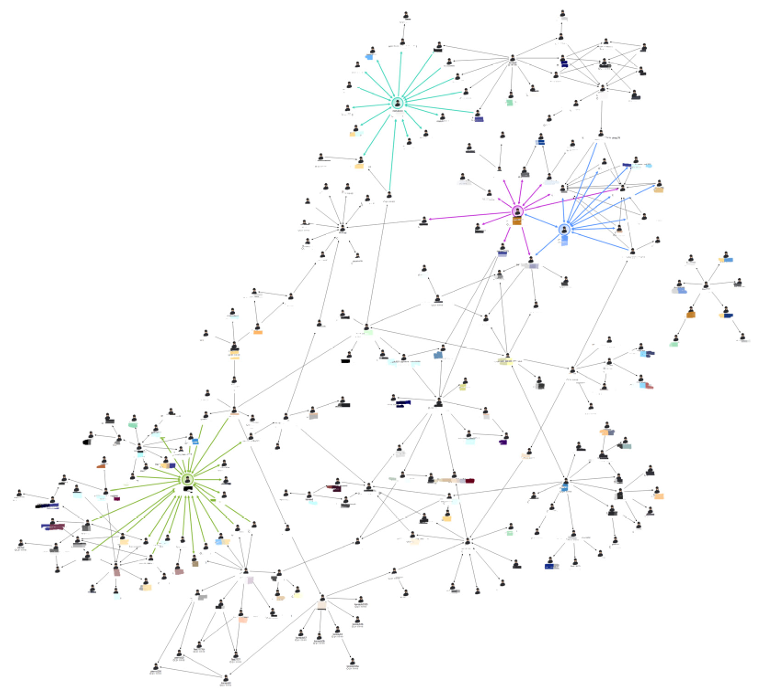 한글 다크웹 판매 게시글에서 1차적으로 식별한 텔레그램 ID는 7개이다. 이를 출발점(seed)로 설정한 후 텔레그램 플랫폼의 검색엔진을 이용해 결과로 나온 계정을 1차적으로 수집하고, 연결된 계정을 2차적으로 수집하여 총 343개의 계정을 확보하였다. 각 계정의 관계도를 시각화하기 위해 수집된 출발점 계정과 1차·2차 연관계정을 모두 엔티티로 설정한 후 계정 간 연결관계를 엣지로 구성하여 연관성 네트워크를 생성하였다.