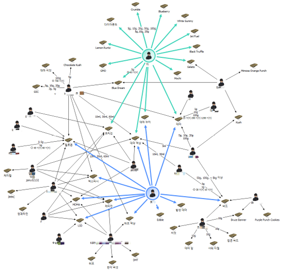 분석결과, 주요 계정간 대마 등 마약류 전문 조직(초록색), 합성마약 중심 조직(파란색), 양쪽을 연결하는 혼합 취급 계정으로 구분되는 조직적 패턴이 확인되었다. 이 중, 계정명 ‘미O’는 Blueberry, White Gummy, Jet Fuel, Crumble, Gelato, GMO 등 대마 품종 중심의 상품군이 집중적으로 연결되어 있었다. 또한 이 계정이 취급하는 거래 용량은 5g, 10g, 20g, 50g, 100g 등 도·소매를 모두 포함하고 있었다.