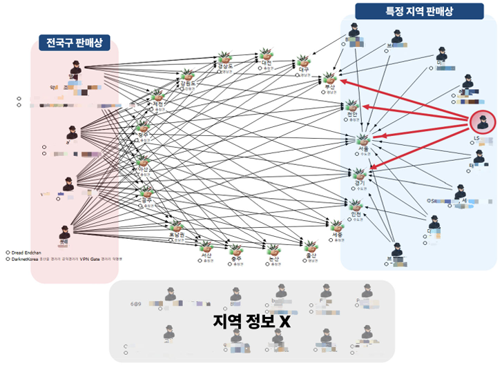 분석결과, 제주를 제외하고 전국 거래가 가능한 게시자는 전체 23명 중 4명이었으며, 이중에서도 ‘약사’와 ‘붓다’ 계정은 가장 넓은 활동 범위와 가장 높은 게시 빈도를 보였다. 수도권(서울, 경기, 인천)을 제외한 지역 중 가장 많이 언급된 지역은 부산으로 나타났다. 부산은 물류 중심지로서 마약 판매자들이 직접 마약을 반입하기에 유리한 지역적 특성을 갖고 있다. 이러한 특성은 불법 정보 판매자들이 물리적 위험을 분산하기 위해 물류 접근성이 좋은 지역을 중심으로 활동 범위를 설정하는 전형적인 마약 유통 패턴과 유사하다[35].